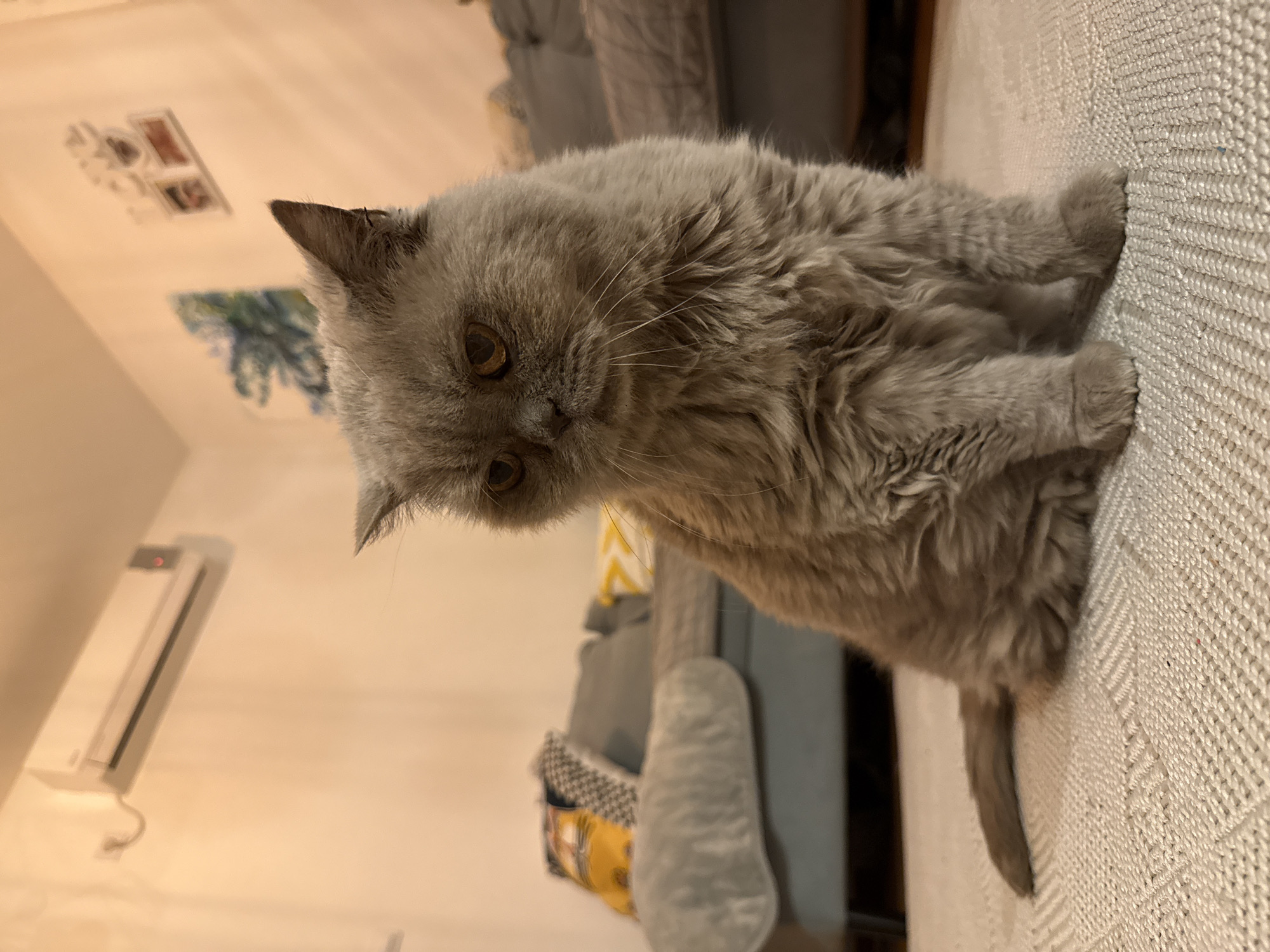 - "A grey British Shorthair cat is sitting on a beige textured sofa" by FM-hPg8L2, licensed under CC BY 4.0