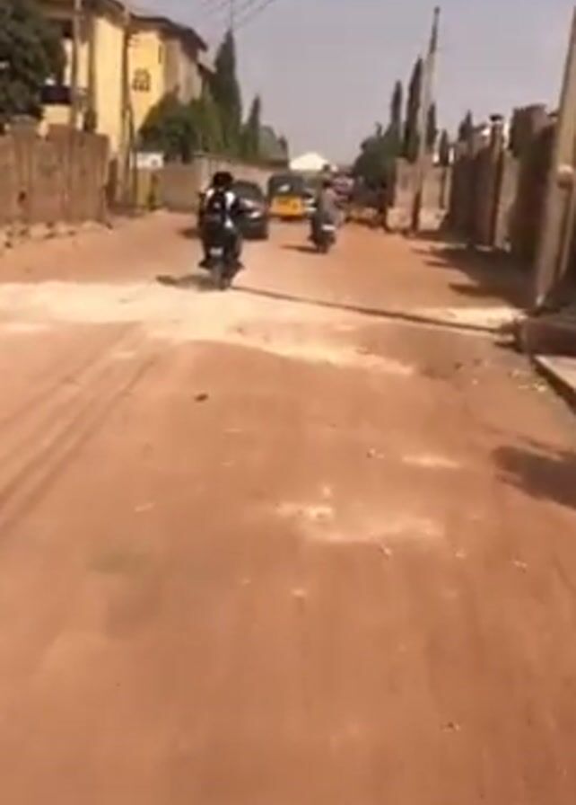 street view in a residential area. The road is made of dirt and sand, with patches of concrete. There are buildings on either side of the road, and power lines overhead. Several vehicles are moving down the road, including motorcycles, a car, and a three-wheeled vehicle. The sky is bright and clear.