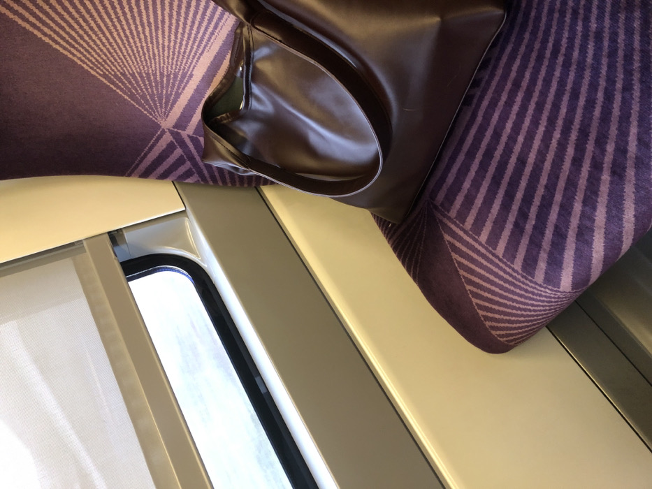 Within a train in Bernolsheim, France, a brown tote bag rests on a purple upholstered seat