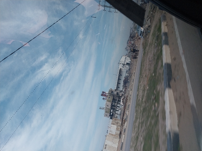 The image depicts a scene of extensive structural damage in a-Zawayda, Palestinian Territory, viewed from the interior of a moving vehicle. In the immediate foreground, the bottom right shows a dark structural element of the vehicle, likely a window frame or pillar. A multi-lane paved road runs horizontally across the mid-ground, featuring a concrete median barrier painted with alternating black and white stripes. Beyond the road, on a slightly elevated area, lies a landscape dominated by severe destruction. The central subject is a large, multi-story building appearing significantly damaged or partially destroyed, located on the far side of the road to the left. Its facade is severely compromised, revealing internal structures, exposed rebar, and large sections of debris piled around its base. On the roof of this building, multiple communication towers or industrial structures, some featuring red and white elements, are visible. Arabic script is faintly discernable on the remaining walls of the building. To the right of this primary structure, extending along the roadside, are further scattered rubble and remnants of other destroyed buildings. In the mid-ground, near the right side of the road and amidst the debris, several indistinct human figures, approximately three to four, are standing. A light-colored sedan or hatchback is partially visible near these figures. The ground between the road and the damaged structures consists of dry grass and dirt. Overhead, the sky is light blue with scattered white, wispy clouds, and multiple dark power lines or communication cables traverse the upper portion of the frame. The overall scene suggests a post-conflict or post-disaster environment.