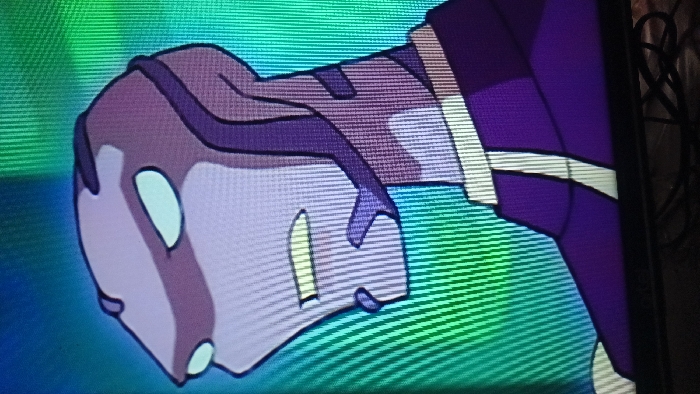 The image is a photograph of a screen displaying an animated character