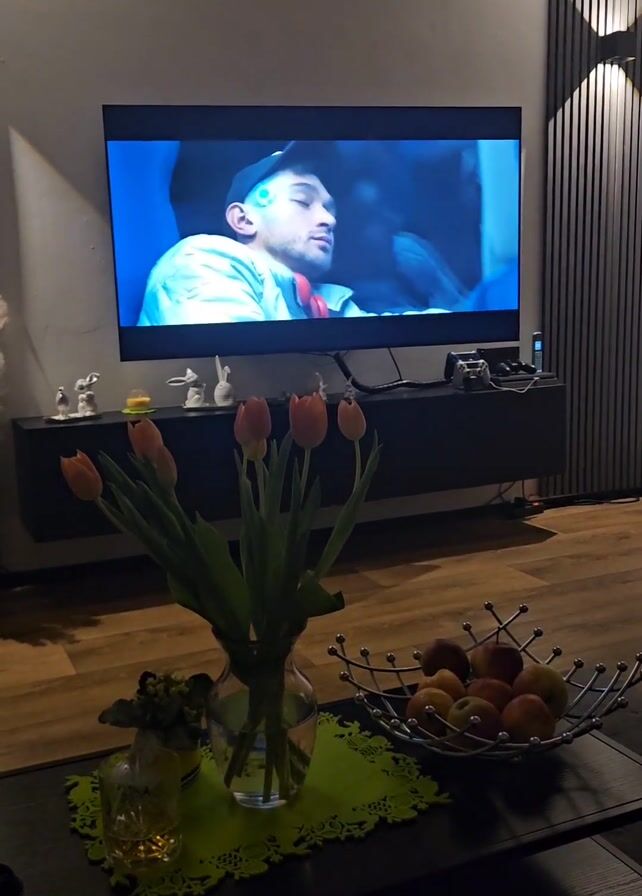 interior of a living room. A large TV is mounted on the wall, displaying scenes from a music video featuring young men and women in various emotional states. Below the TV is a black TV stand with decorative figurines on top. In the foreground is a coffee table with a vase of orange tulips, a small decorative pot, and a bowl of peaches. The floor is wooden. To the right of the TV is a decorative wall panel with vertical lines and a modern wall lamp.