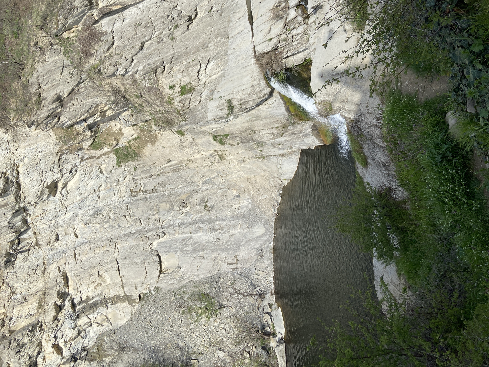 This is an aerial view of a waterfall and river in Pchelishte, Bulgaria