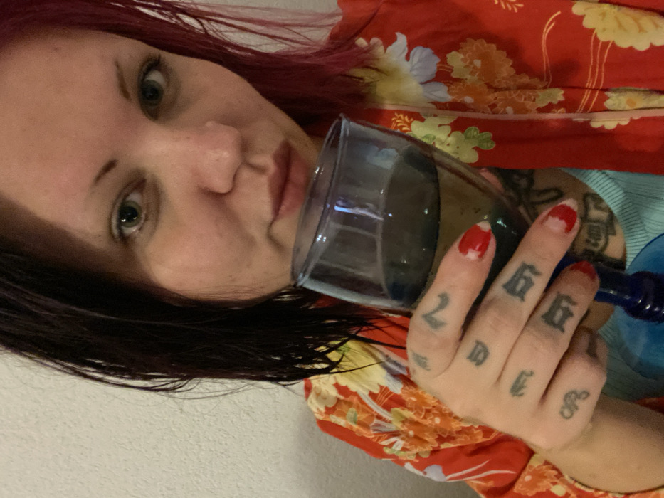A close-up portrait depicts an individual with bicolored hair, dark on the left and pink on the right, and green eyes, looking directly forward. The person holds a blue-stemmed glass containing a clear liquid with their right hand. The fingers of the right hand are adorned with dark, stylized letter or number tattoos, and the fingernails are painted red, showing some chipping. A dark tattoo is visible on the individual's upper chest/collarbone area. The person is wearing a red garment with a yellow, orange, and green floral pattern, layered over a light blue garment. The background consists of a plain, light-colored, textured wall, indicating an indoor setting. The scene is located in the city of Kunje, Montenegro.