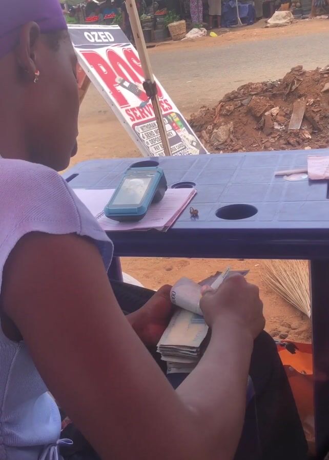 A woman is sitting at a blue plastic table and counting a stack of paper money. She is wearing a light purple head covering and a light purple shirt. On the table is a blue electronic device, a notebook with papers, and a small object. Behind her is a sign that reads "OZED POS SERVICES" with a list of services below. In the background is a street scene with people, umbrellas, and what appears to be a market area. There is a pile of dirt or construction debris visible in the mid-ground. The ground is reddish-brown.