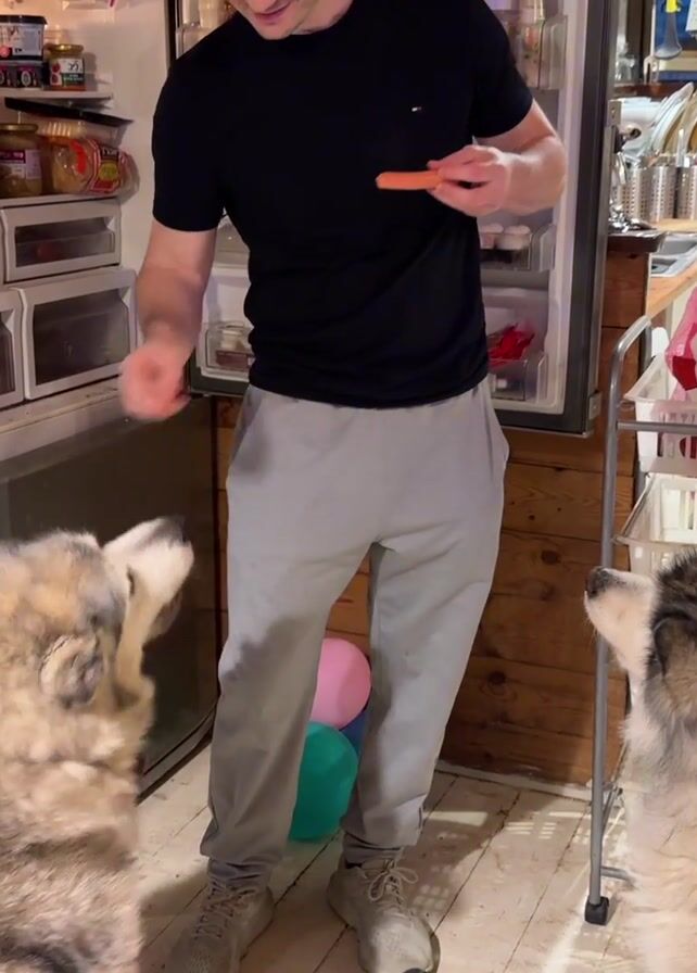 A man in a black t-shirt and gray sweatpants is standing in a kitchen, facing the open door of a refrigerator. He is holding a piece of food, likely a sausage, and feeding it to one of two Alaskan Malamutes that are standing in front of him. The dog takes the food from his hand. The kitchen has stainless steel appliances, wooden furniture, and white floors. There are balloons on the floor. The refrigerator is full of food. The kitchen appears to be in a somewhat rustic or older home. The man smiles as he feeds the dog.