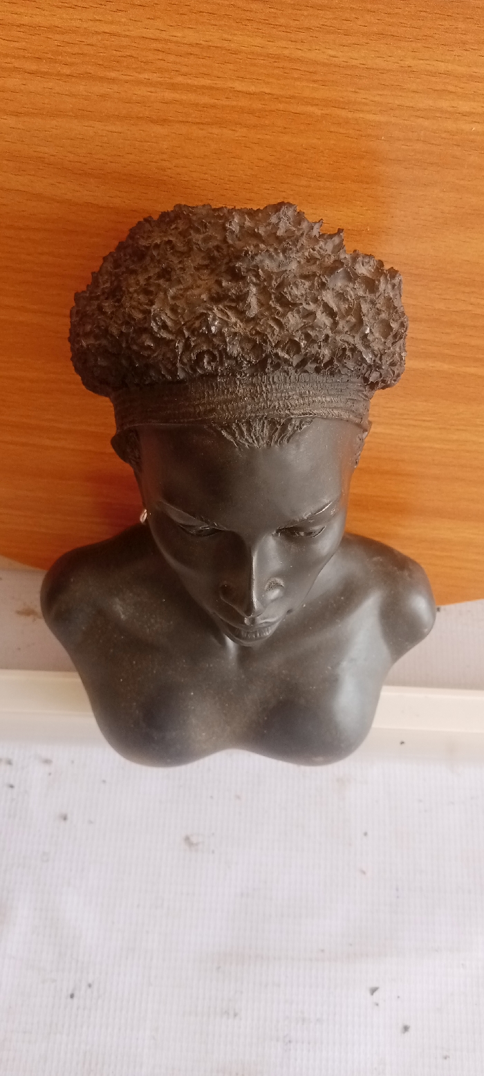 The image displays a dark-colored bust, likely made of metal or composite material, depicting the head and upper torso of a stylized human figure with African features