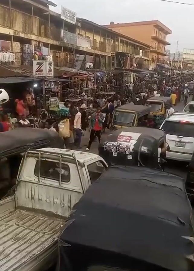 densely populated street scene in what appears to be a market or shopping district. The street is crowded with people walking amidst heavy traffic, primarily consisting of three-wheeled vehicles commonly known as "tuk-tuks" or auto rickshaws, along with at least one white pickup truck and a white SUV. The buildings lining the street are multi-story and feature numerous storefronts with signs and advertisements. Some buildings have laundry hanging from their balconies. A person wearing what looks like a police uniform is seen walking through the traffic. The sky is overcast, suggesting it may be early morning or late afternoon. The overall atmosphere seems chaotic and busy.