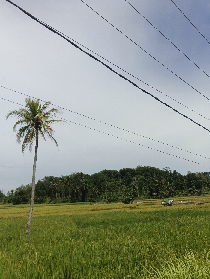 A landscape features a lush green rice field under a cloudy sky. A solitary palm tree stands tall on the left, its fronds swaying gently. In the background, a dense forest covers a small hill. Power lines stretch diagonally across the upper portion of the frame. The scene evokes a sense of peaceful rural tranquility.