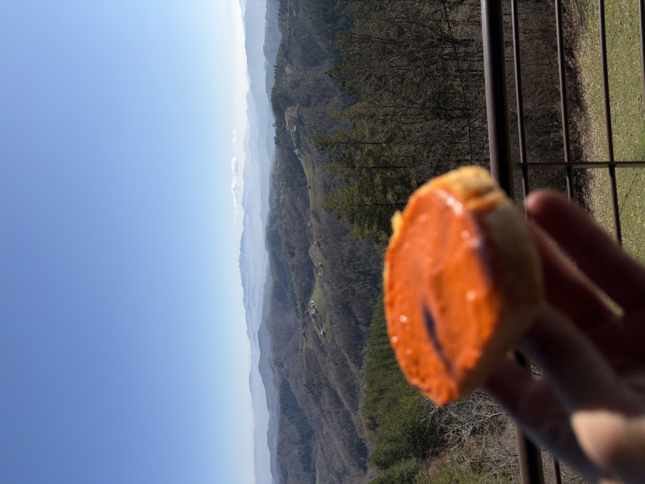 The image displays a panoramic view of a mountainous landscape, identified as being in the city of Presoka, Bulgaria, under a clear blue sky. In the immediate foreground, a human hand, out of focus, holds a circular piece of bread or bun, approximately 8-10 cm in diameter, topped with a thick, vibrant orange-red spread that exhibits a dark, elongated mark. A dark, thin metal railing is partially visible below the hand. The midground features multiple layers of rolling hills and mountains, largely covered by deciduous trees in a dormant state, interspersed with some evergreen coniferous trees. Small clusters of buildings, indicative of settlements, with dark roofs are scattered across the hillsides. The background presents additional layers of mountains receding into the distance, appearing progressively lighter blue due to atmospheric haze, with the furthest peaks showing patches of white consistent with snow. The sky above is clear and bright blue, with only faint wispy clouds visible above the most distant mountain ridge. The scene is illuminated by natural daylight.