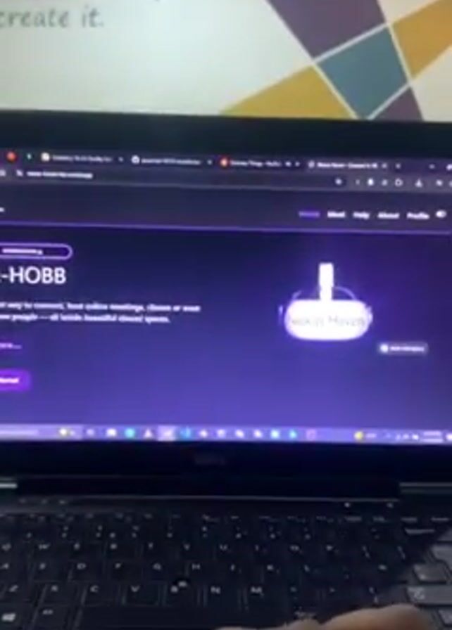 A medium shot of a laptop screen shows the Nexus Have website. A hand rests on the laptop's trackpad. The website is white and purple and features an image of a VR headset. Text on the page reads "Nexus Hobb". The laptop is on a surface with some colorful posters in the background. The image is slightly blurry. Pop music plays in the background.