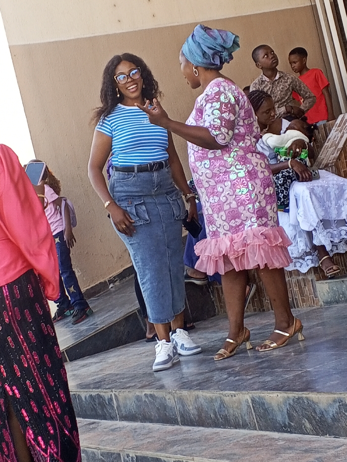 The scene depicts a group of individuals gathered on a set of steps outdoors in Sabon Gari West, Nigeria. In the foreground, two adult women are engaged in conversation. The woman on the left, with dark curly hair and glasses, wears a blue and white striped short-sleeve shirt, a dark belt, a faded blue denim midi-skirt with front pockets, and white and grey sneakers. She is smiling and gesturing with her right hand while holding a dark smartphone in her left. The woman on the right wears a patterned blue and purple headwrap, a knee-length light pink dress with an iridescent floral pattern and a ruffled pink tulle hem, and gold-colored heeled sandals. She faces the first woman and gestures with her left hand. In the mid-ground, a woman is seated to the right, holding a baby wrapped in a white blanket. Behind her, three children are visible, including two boys standing, one in a patterned shirt and another in a red shirt. On the far left, a person is partially visible wearing a pink top and a black patterned skirt, holding a smartphone. Another child in a pink shirt and dark trousers with yellow star patterns is partially visible further back on the left. The environment includes a plain light brown wall in the background and dark grey, textured steps on which the individuals are positioned. The scene is brightly lit by natural light.