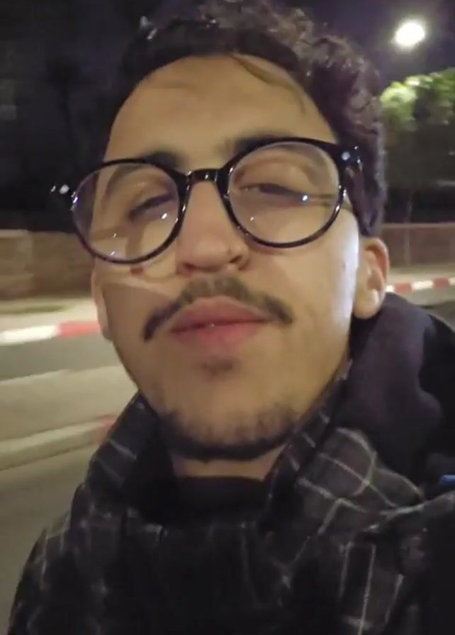 person with glasses and a mustache standing on the side of a road at night. The person is wearing a scarf and a dark jacket. The road is illuminated by streetlights and car headlights. The camera view is shaky, probably due to being handheld.