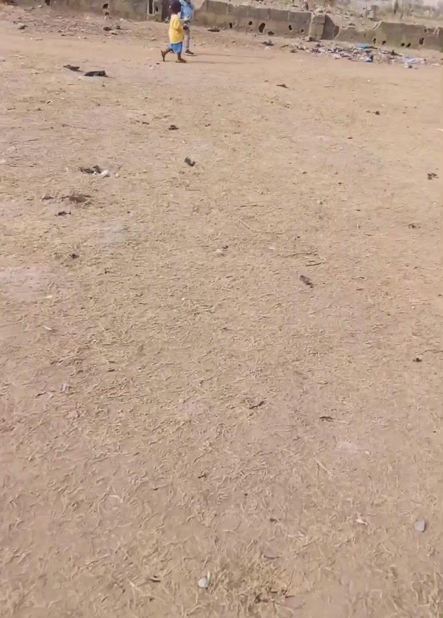 Two children, one in a yellow shirt and blue shorts, and the other in a white-and-black striped shirt, are walking across a dirt-covered field. The field is littered with straw, debris, and small rocks. In the background, there's a partially constructed brick building and a gray fence. The overall environment appears to be an undeveloped or somewhat neglected area. The video seems to be taken from a stationary position.