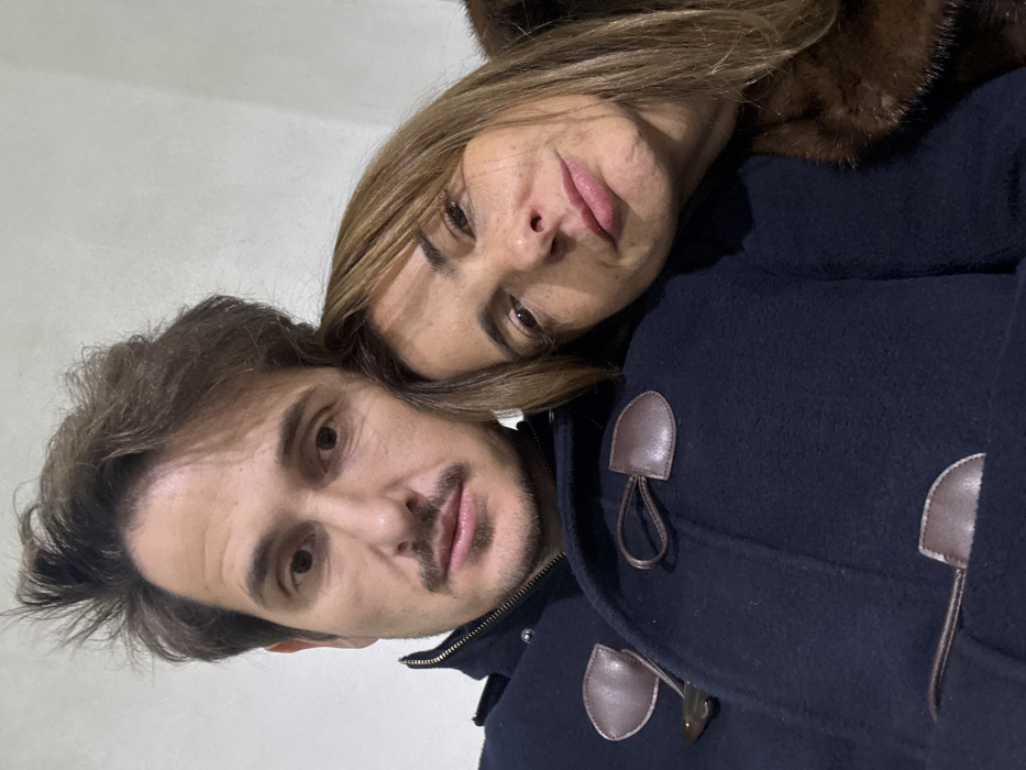 A selfie shows a man and woman intimately posing. The man, with dark hair and a neatly trimmed mustache, looks directly at the camera. The woman leans her head against his, with her face slightly angled. She has shoulder-length brown hair. The man wears a dark navy coat with distinctive leather toggle closures, while the woman wears a darker furry item. The background is a plain, off-white wall.