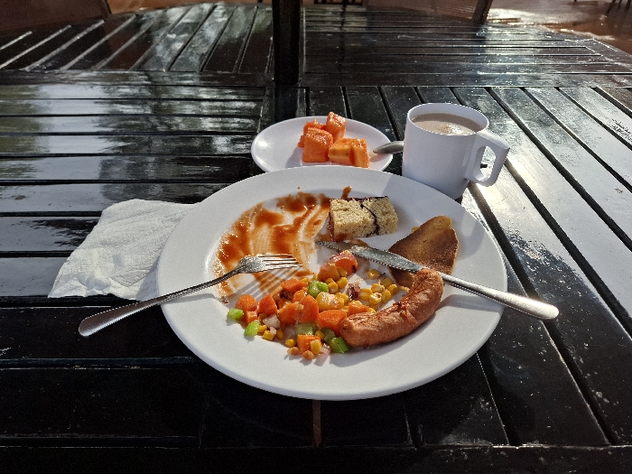 The scene depicts a partially eaten meal on a black wooden table. The meal consists of a white plate containing a sausage, vegetables, a small piece of cake, and a small amount of pancake, along with a fork and knife. There is a white napkin to the left of the plate. To the right of the plate is a white coffee cup. In front of the coffee cup is a small white plate containing several cubes of orange papaya. The scene is located in Karagita, Kenya, at coordinates -0.754 latitude and 36.438 longitude. The table appears to be outdoors, as the surface is wet, possibly from rain. The scene is likely from a restaurant or cafe.