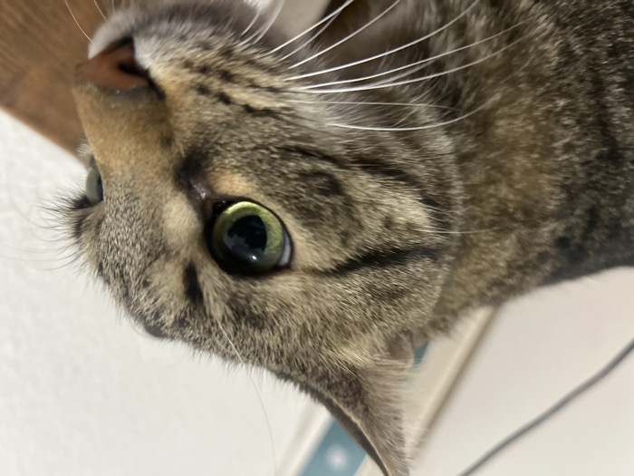 A close-up image reveals the head of a tabby cat angled towards the upper left