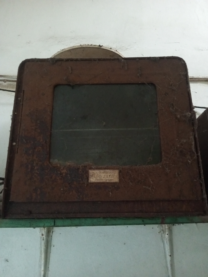 - "A dusty, rectangular metal box with a centered glass window rests on a green and white ledge" by FM-nQeYW2, licensed under CC BY 4.0