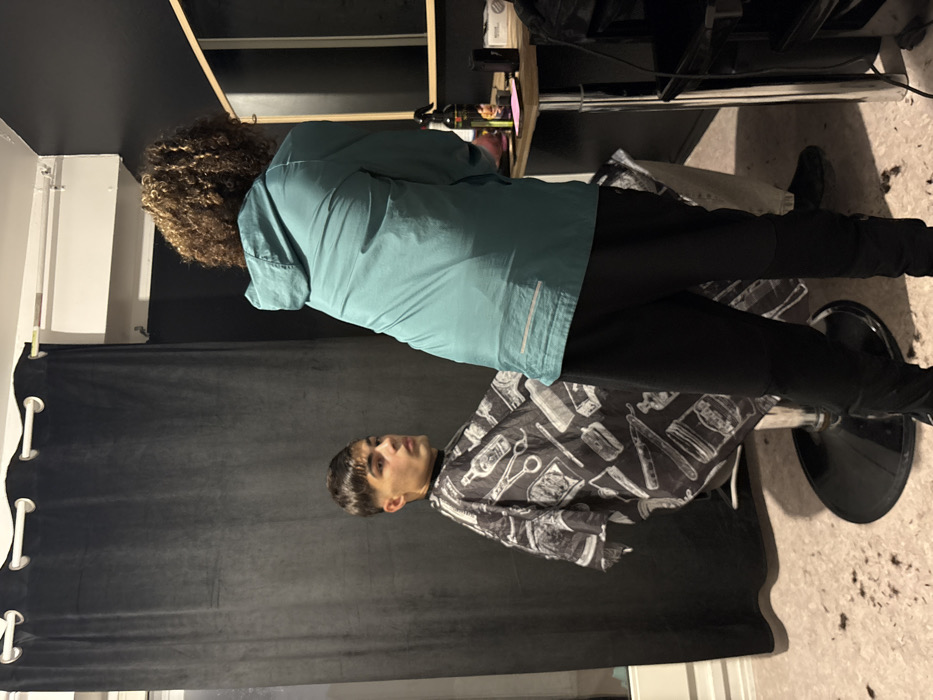 The scene depicts the interior of a barbershop in Ostwald, France. A young adult male, the client, is seated in a black, hydraulic barber chair, wearing a black and white barber's cape adorned with illustrations of scissors, razors, and bottles. He has dark hair styled with a fade, is turned slightly to his left, and is looking directly forward with a neutral expression. To his right and partially obscured, a second individual, presumably the barber, is positioned from behind. This individual has curly, reddish-brown hair and is wearing a teal hooded jacket and black pants. Scattered dark hair clippings are visible on the light-colored floor around the base of the barber chair. On the right, a counter or table holds a black spray bottle, a dark brown bottle, and other indistinct items. A large rectangular mirror with a light wooden frame is mounted on the dark wall to the right. The background on the left features dark grey curtains with white grommets, hung from a white rod, and a white wall-mounted air conditioning unit is visible above them. The walls are predominantly dark.