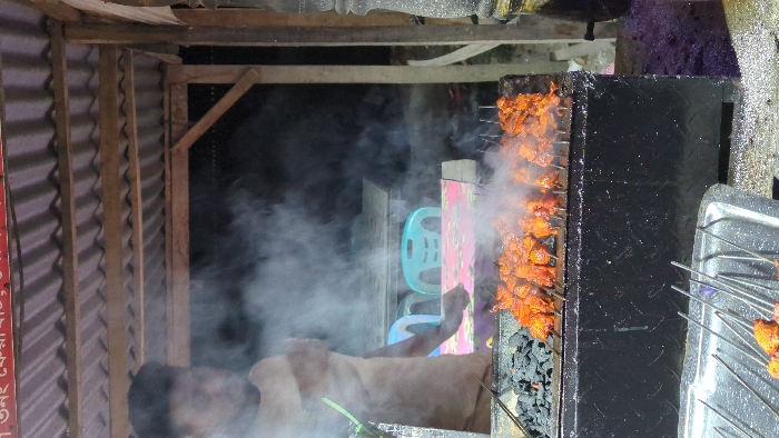Skewered meat is being grilled over hot coals, generating a dense cloud of smoke. The food stall appears to be constructed with corrugated metal and timber framing. A man stands near the grill, seemingly tending to the cooking process. Behind him, blue plastic chairs are visible. A metal tray filled with skewers sits to the right of the grill.