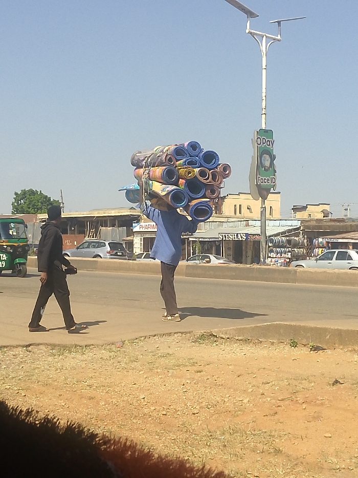 This image captures a daytime street scene in Jos, Nigeria. In the foreground, a man wearing a blue long-sleeved shirt and dark trousers walks rightward across a dirt and gravel path, expertly balancing a large, multicolored stack of rolled mats on his head. The mats exhibit various patterns and colors, predominantly blue, green, and pink. To his left, slightly ahead, a second man in a black hoodie and black trousers walks in the same direction, appearing to hold a dark object in his right hand. Behind these individuals, an asphalt road features a concrete median strip. Various vehicles are visible on the far side of the road, including a silver sedan, a dark SUV, and a partially visible green auto-rickshaw (Keke Napep) on the far left with "KETA 19" written on its side. Commercial buildings line the background, featuring storefronts. One visible sign partially reads "PHARMACY," and another prominently displays "STESHA'S." A white street light pole with two solar panels at its apex stands on the right side of the frame, bearing a vertical banner advertising "OPay Face ID," featuring a stylized bearded face. The sky above is clear and blue.