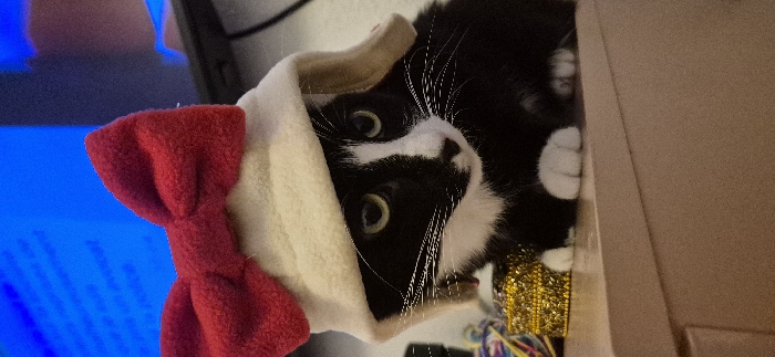 A black and white tuxedo cat is depicted in a close-up, indoor setting. The feline wears an off-white, soft hat adorned with a prominent red bow centered on top. The cat's eyes are a greenish-yellow, and it possesses long white whiskers. It sits on a light brown or beige flat surface, with its front paws tucked. To the left of the cat's body, a small, rectangular object covered in reflective gold tinsel is visible, alongside colorful tangled yarn or string. The background is blurred, featuring a dominant blue light source or screen on the upper right side. The image does not contain any visual information to determine a specific geographical location, including the city of Strasbourg, France.