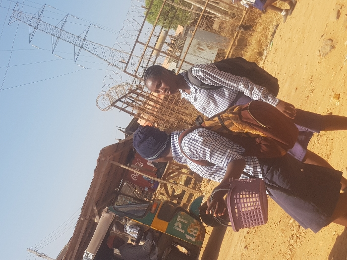 Two young people stand on a dirt road. Both wear checkered shirts, dark shorts, and carry backpacks. One holds a purple basket. An auto rickshaw is partially visible behind them with "PT 18" on its side. In the background is a fence with barbed wire and an electrical power tower. The sky is light blue.