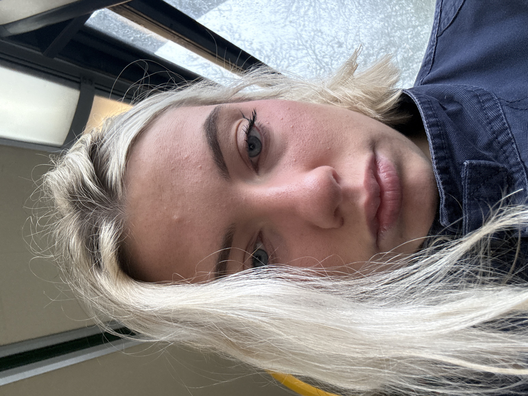 - "A close-up portrait depicts an individual, appearing female, with shoulder-length platinum blonde hair showing darker roots at the scalp" by FM-HUQ9D3, licensed under CC BY 4.0
