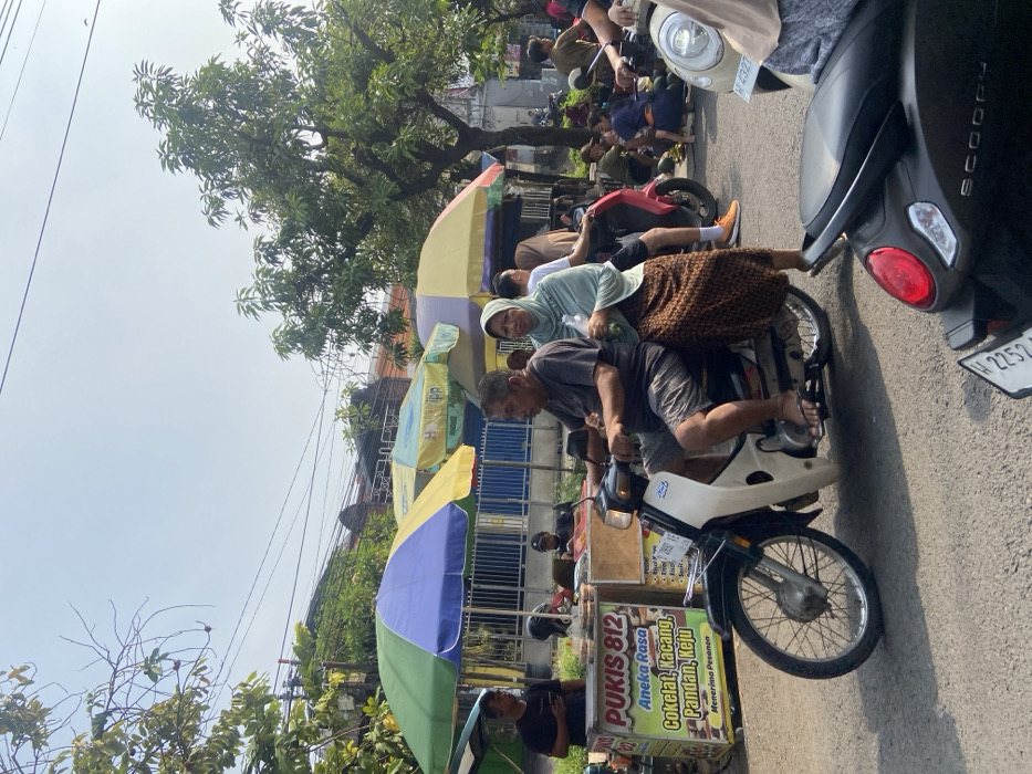 A street scene depicts an older man driving a white motorcycle with a box labeled "PUKIS 812 Aneka Rasa" attached to the front. Seated behind him is a woman wearing a headscarf and a patterned brown skirt. The street is lined with parked motorcycles and food stalls with colorful umbrellas. In the background, a crowd gathers near a tree. The sky is overcast, and power lines stretch across the top of the frame.