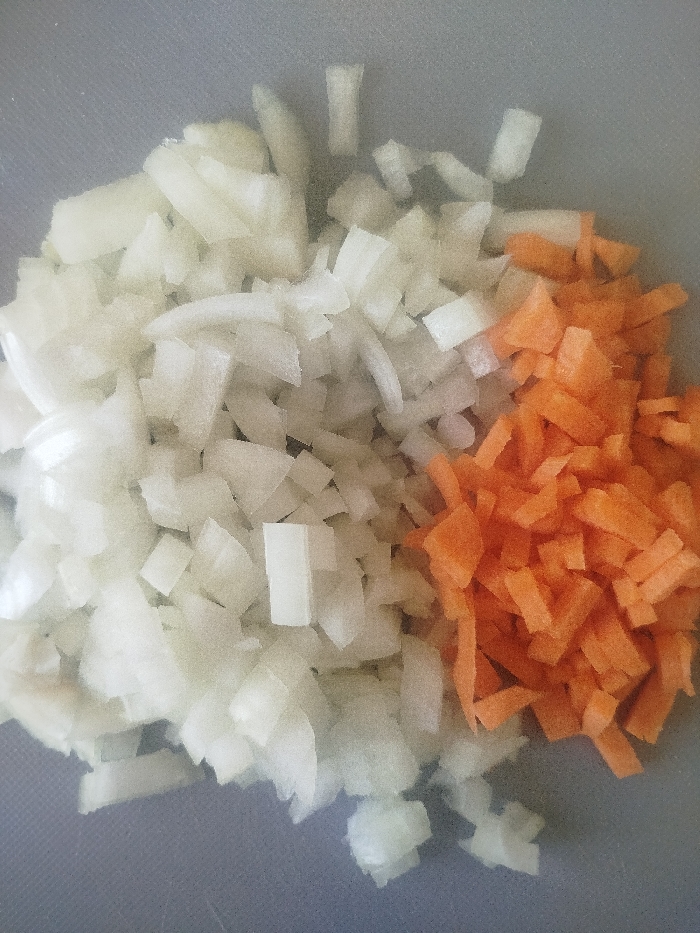 - "In the city of Klenovik, Bulgaria, a close-up overhead view captures two distinct piles of diced vegetables resting on a light gray, textured surface, likely a cutting board" by FM-jg5Lp1, licensed under CC BY 4.0