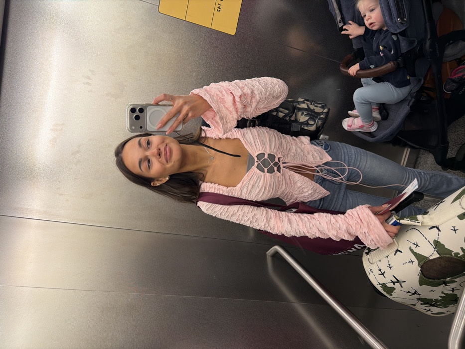 A woman in a pink top and jeans takes a selfie in an elevator. She holds a phone in her right hand and faces the camera. A maroon purse hangs from her left shoulder. Behind her, a baby sits in a stroller. A suitcase with airplane patterns sits near the elevator door. A yellow sign is partially visible at the top of the frame. The elevator wall is a light gray color.