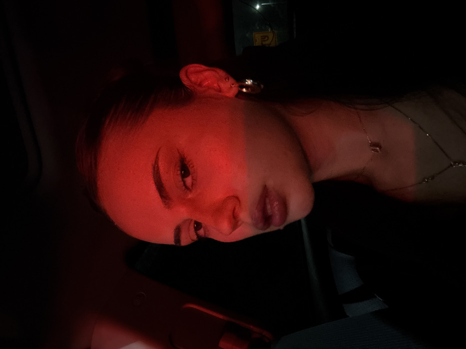 A woman's face is bathed in red light, contrasting with the deep shadows surrounding her