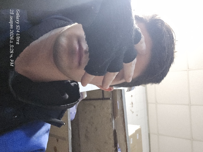 The image depicts a male individual, appearing to be a young adult, in a close-up, indoor setting within the city of Svishtov, Bulgaria. He is partially obscuring his face with his left hand, which is covered by a black fingerless glove, specifically covering his eyes and forehead. His dark hair is visible at the top of the frame, and his lower face, including his nose, lips, chin, and jawline with light stubble, is visible. He is wearing a dark, possibly black, hooded garment, and a blue layer of clothing is visible on his right shoulder. The background is out of focus but reveals an indoor environment with a white grid-panel ceiling and, to the right, a shelf or workbench stacked with light brown cardboard boxes and other indeterminate items, suggesting a storage or work area. Strong lighting illuminates the left side of the subject. Overlaid text in the lower-left corner indicates "Galaxy S24 Ultra" and "25 март 2026 г. 5:28 ч. PM" (March 25, 2026, 5:28 PM).
