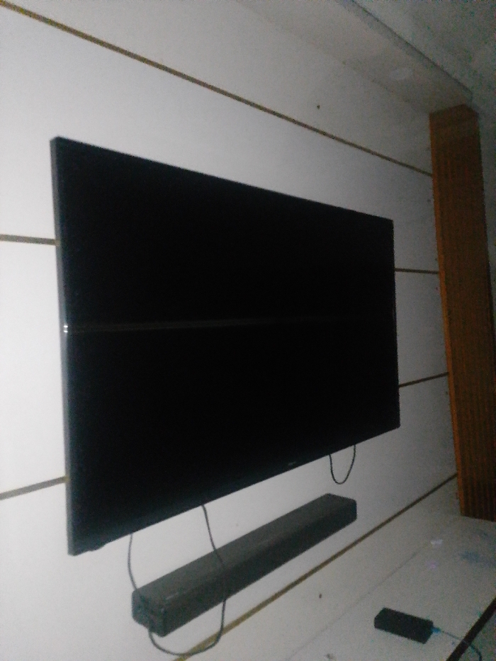 A wall-mounted flat-screen television dominates the scene. Below it, a soundbar is also mounted on the wall. A dark rectangular object sits on a white surface in the foreground. The wall appears to be made of horizontal planks, with thin, dark strips separating them. A tall, narrow wooden structure with vertical slats stands on the right side. The overall lighting is somewhat dim.