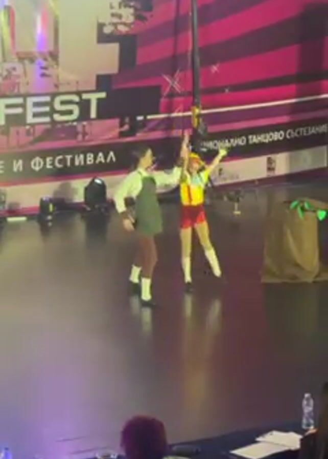 On a stage at what appears to be a dance competition/festival, two dancers are performing