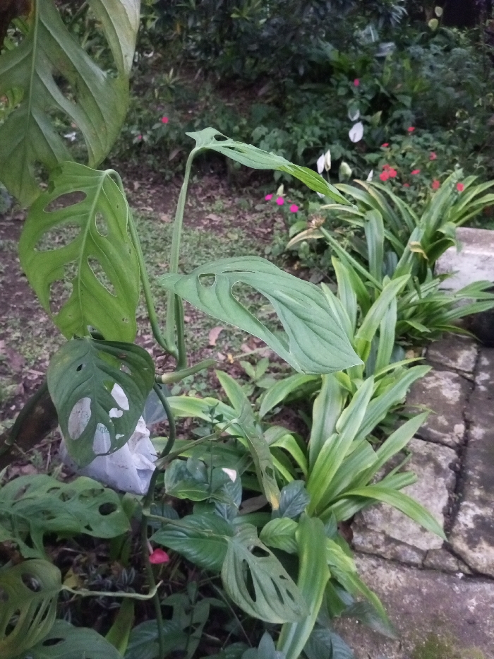 The scene depicts a dense botanical setting in Balapur, India. In the foreground and central view, a vining plant identified as a Monstera species, possibly *Monstera adansonii*, is prominent. Its dark green leaves feature characteristic fenestrations (natural holes and slits). Multiple leaves are visible, some appearing older and more developed, while others are newer and lighter green. A crumpled white plastic bag is partially visible near the base of this plant in the lower-left quadrant. To the right, a border of light green, elongated, strap-like foliage plants grows alongside a section of uneven, grey stone paving. The background consists of a verdant arrangement of various green shrubs and plants, with scattered small red and pink blossoms and some white flowers. The ground is dark, exposed soil, suggesting an unpaved garden area. Natural, diffused light illuminates the scene, indicating an overcast day or soft light conditions. No human presence or specific actions are depicted.