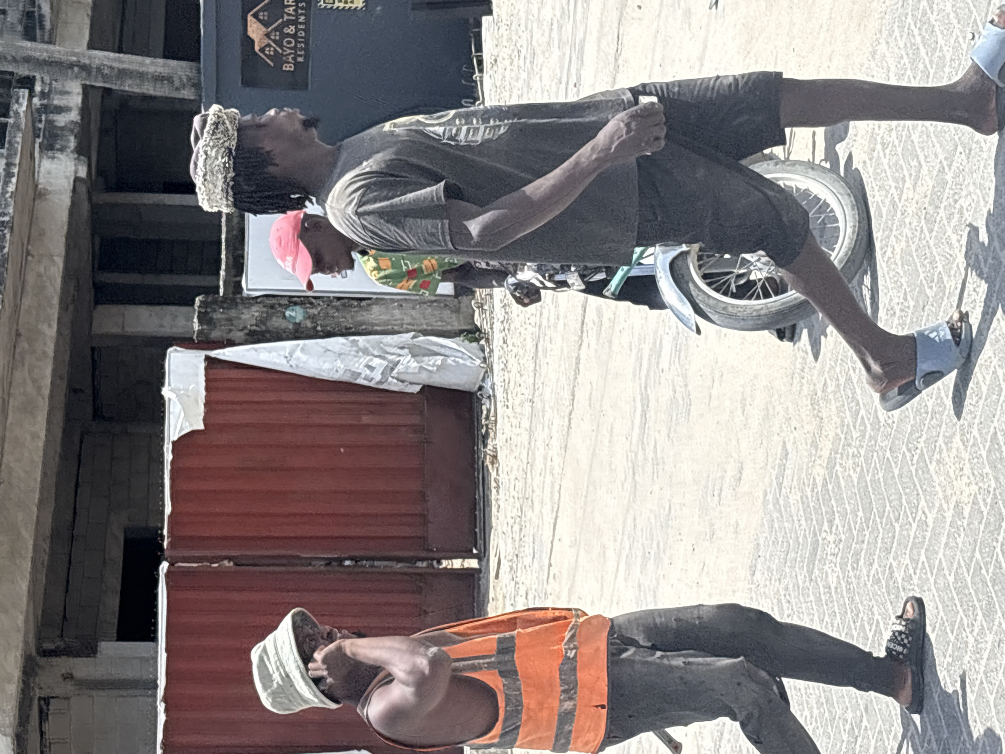 In Igboefon, Nigeria, two men are seated on a parked motorbike, while another man stands nearby. The first man on the motorbike wears a white and tan head wrap, dark t-shirt, dark shorts, and light blue sandals. The second man on the motorbike wears a red hat and multi-colored shirt. The third man standing wears a white bucket hat, orange safety vest, dark pants, and black and white slides. A red storage container is behind the standing man. A partially constructed building is behind the men on the motorbike. A sign with the words "BAYO & TARO RESIDENTS" is adjacent to the building. The ground is a concrete sidewalk.