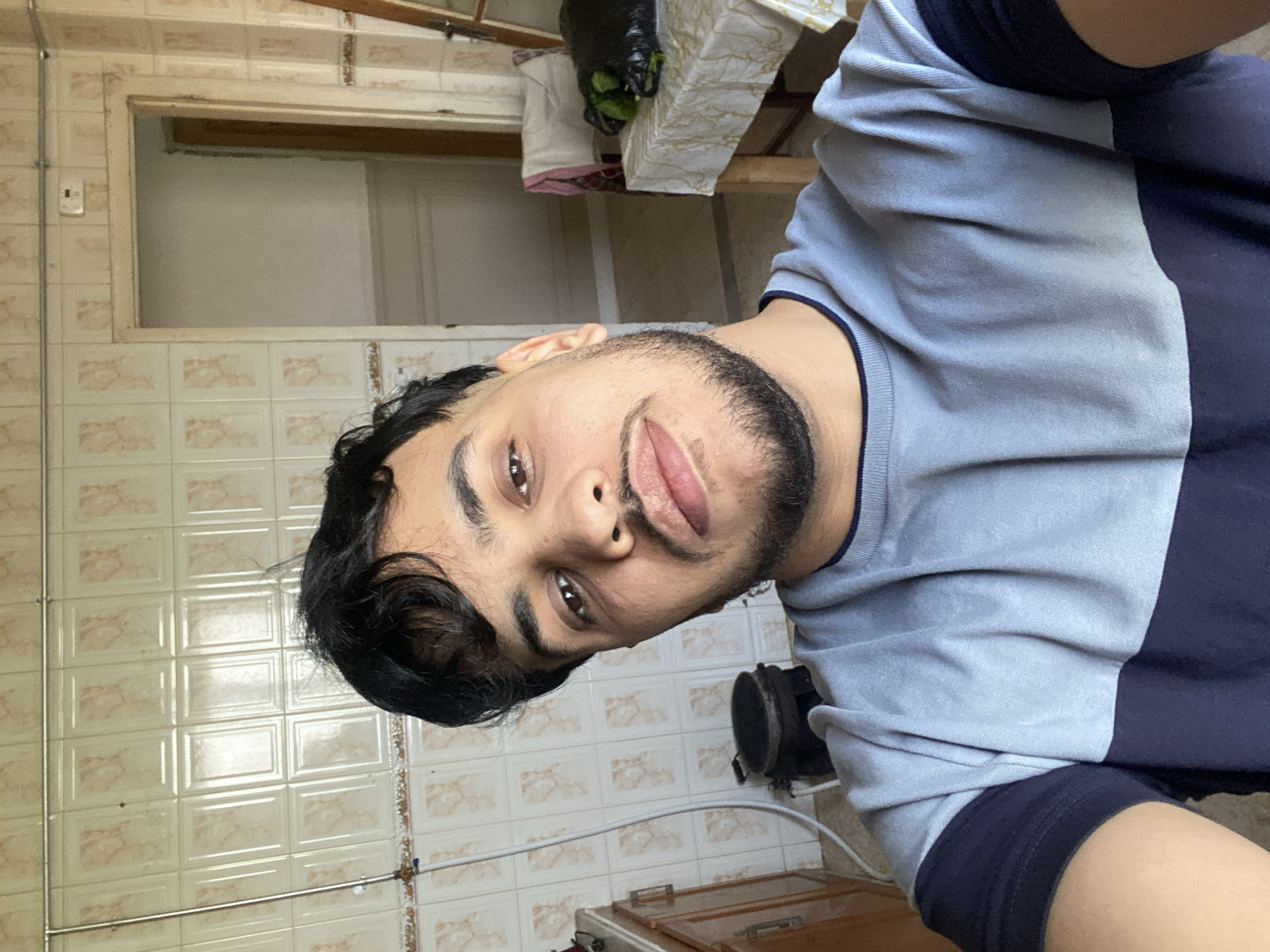 A male subject, adult, with dark hair, a trimmed beard, and mustache, is centrally positioned in a close-up, chest-up view. He wears a short-sleeved polo shirt featuring a light blue-grey upper section and a dark blue lower section. His gaze is directed forward towards the camera, maintaining a neutral expression. The scene is an interior domestic setting, identified as the city of Baraki, Algeria. The background walls are covered with light-toned, rectangular ceramic tiles arranged in a grid pattern, some exhibiting subtle decorative motifs or minor discoloration. A thin metal rod runs horizontally across the upper portion of the tiled wall. To the left of the subject, a partial view of a wooden base cabinet with a light-colored countertop is visible. A white flexible hose or pipe is affixed vertically to the tiled wall, connecting to a metal fixture. Below the counter, a dark, round cooking vessel rests on a low, dark stand. To the right of the subject, a doorway opens into an adjacent room characterized by plain, light-colored walls and a lighter floor. A small white rectangular electrical device is mounted on the wall above the doorway. Further right, a light-colored wooden table draped with a white patterned tablecloth is present. A white fabric item is draped over a chair positioned behind the table, and a dark bag or object is also on the table surface. The entire scene is brightly illuminated.