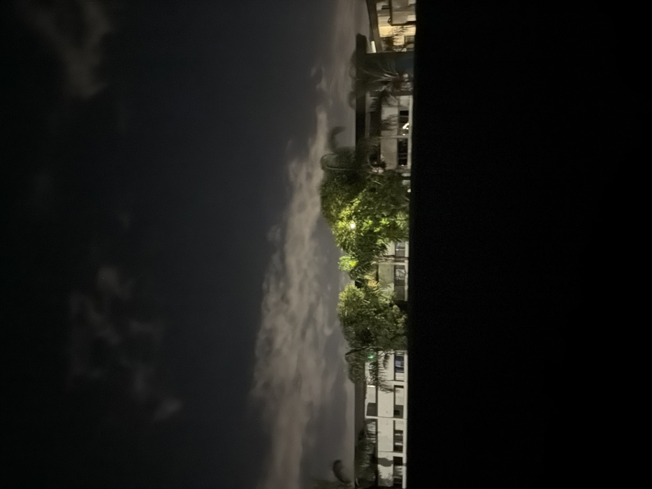 A nocturnal image depicts an urban or suburban scene in San Diego, United States of America. The upper portion of the frame features a dark sky with illuminated, low-lying cloud formations. The lower half is occupied by a dark, featureless foreground element, forming a silhouette, likely an elevated wall or terrain. Above this, a multi-story, light-colored building, characterized by multiple windows and recessed architectural sections, extends horizontally across the midground. Several trees, including visible palm trees and broadleaf species, are interspersed in front of and around the building structure. Certain broadleaf trees are distinctly illuminated by an unseen artificial light source, rendering their foliage a vibrant green. No human subjects, animals, or specific actions are present or discernible within the frame.