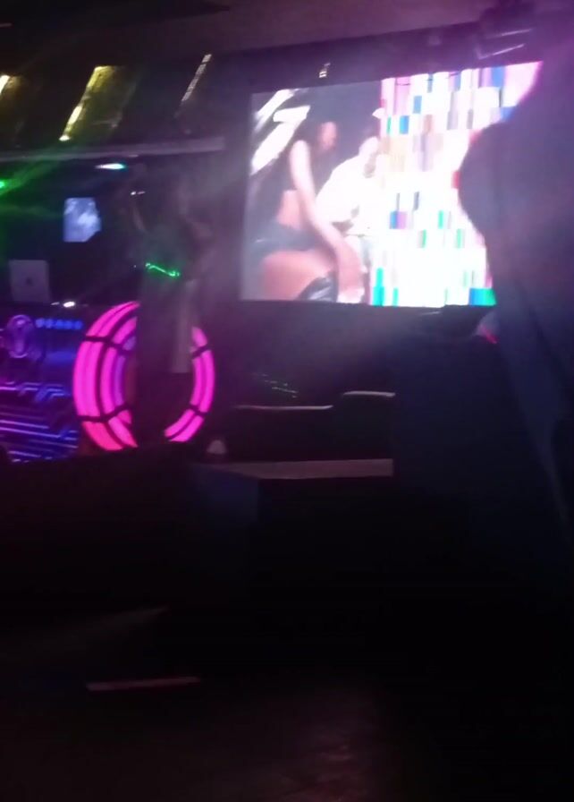 interior of a nightclub or bar. In the foreground is a large, decorative prop with a circular element lit with purple and red lights, surrounded by what appears to be a circuit board design, also illuminated with red light. Behind the prop, there's a screen displaying a music video or performance. The people in the video are not clear. There are some individuals partially visible in the background who appear to be standing or walking around. The club seems dark, illuminated by the screen, the decorative prop, and some overhead lights. There are occasional laser beams that sweep across the room. Overall, the atmosphere is lively and typical of a nightlife venue.