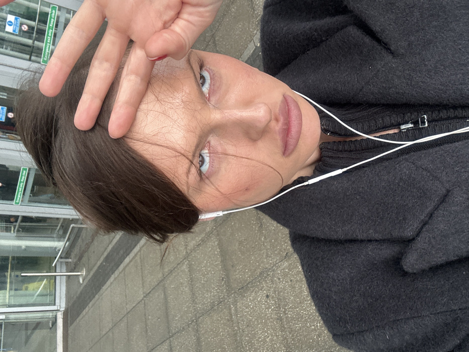 A close-up photograph features a female individual positioned outdoors in front of the modern glass entrance of London Stansted Airport, located within the Uttlesford district, United Kingdom. The individual, with dark brown hair styled in a high bun, is looking directly at the camera with her eyes rolled upwards and her lips slightly parted and downturned. Her left hand is raised, fingers splayed, partially obscuring her forehead, with red polish visible on one fingernail. She is wearing white wired earphones, with the wires extending down her chest over a dark grey wool-blend coat worn above a black ribbed, zippered sweater. The background consists of multiple clear glass doors with silver handles and vertical frames. Green "Emergency exit only - Keep clear" signs are visible on the glass. The ground is paved with light grey concrete slabs, and silver metal bollards and railings are present in front of the entrance. Reflections within the glass doors suggest interior lighting and obscured figures.