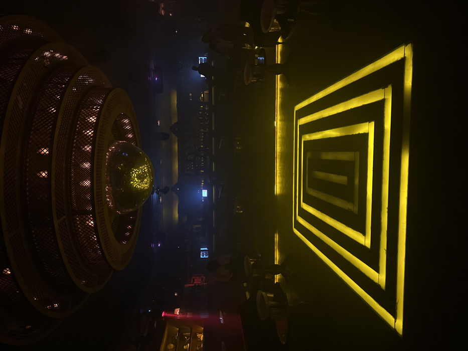 An overhead shot captures a dimly lit interior. On the left, a multi-tiered, circular fixture with a disco ball core emanates soft, warm light. Along the right edge, a geometric pattern of illuminated, nested squares casts a vibrant yellow glow. In between, a shadowy bar scene unfolds with patrons seated at high-top tables. A mix of blue and red light sources contribute to the nightclub ambiance.