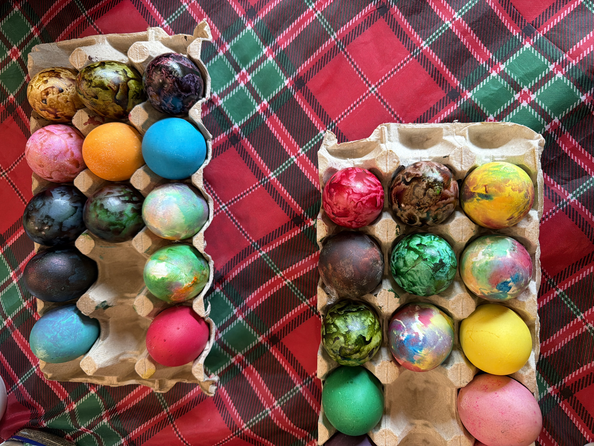 - "Two egg cartons filled with decorated eggs are placed on a red and green plaid tablecloth" by FM-MFgjC3, licensed under CC BY 4.0