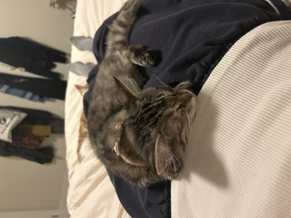 - "A gray tabby cat sleeps on a bed" by FM-p02Wp2, licensed under CC BY 4.0