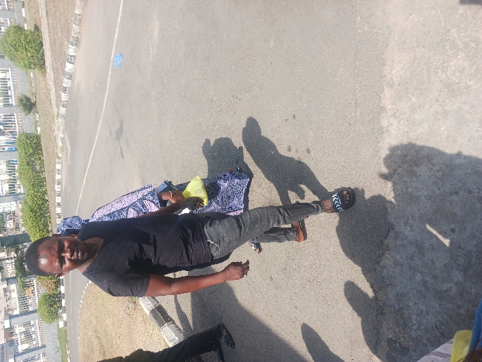An outdoor scene captured in bright daylight shows three individuals on an asphalt road. In the foreground, slightly to the left of center, stands an adult male of African descent, facing the camera. He wears a black V-neck t-shirt, dark grey jeans, and black open-toed sandals with a white and black zig-zag pattern. A ring is visible on his left ring finger. His direct gaze towards the camera is neutral. To his right and partially behind him, an adult female is partially visible, wearing a patterned purple, white, and blue traditional garment and brown open-toed footwear. She holds a translucent yellow plastic bag in her right hand. A third individual's lower legs and feet, clad in dark trousers and sandals, are visible at the far left edge of the frame. Prominent shadows cast by the individuals are visible on the light grey asphalt surface, indicating direct sunlight. A faint white line runs along the asphalt in the mid-ground. To the left, a curb with black and white striped markings separates the road from a grassy area and a line of green hedges. Behind the hedges, multiple multi-story buildings with white fences are visible, suggesting an urban or semi-urban environment. A small, crumpled blue plastic object rests on the asphalt in the mid-ground to the right. A precise location within Lokoja, Nigeria, is not discernible from the visual evidence presented.