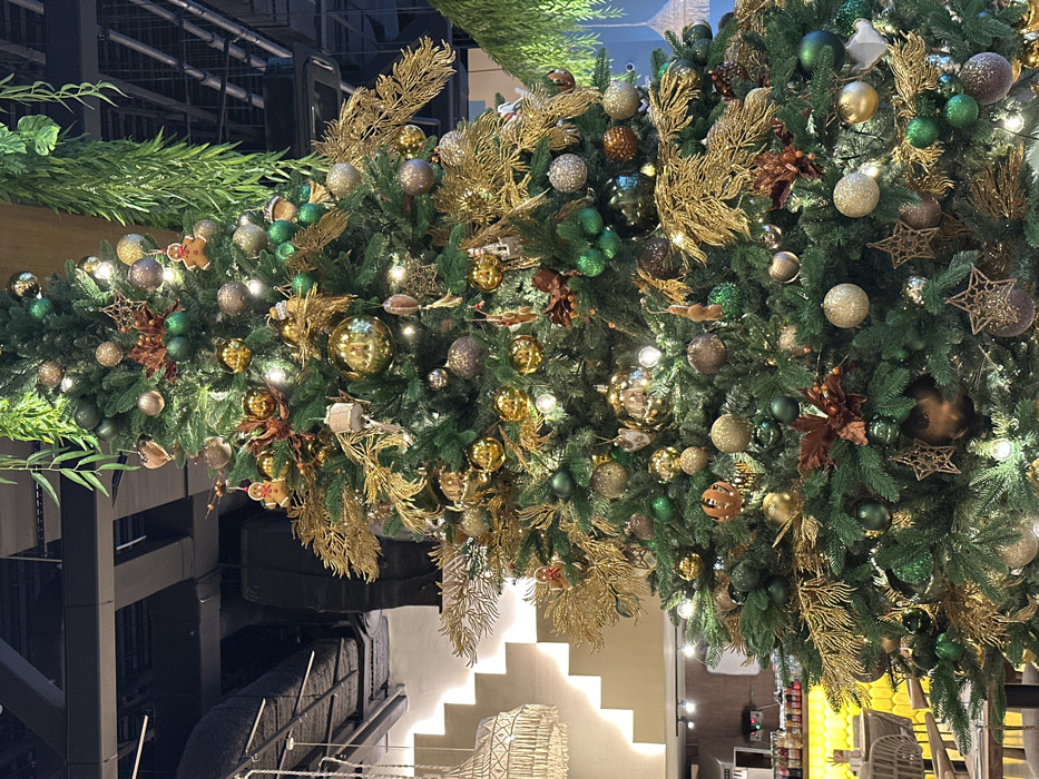 A vertical image captures a large, artificial Christmas tree dominating the foreground of an indoor commercial space identified as being in Murino, Russia. The tree is heavily decorated with numerous ornaments in a color palette primarily consisting of gold, bronze, and various shades of green. Ornament types include spherical baubles (some glossy, some matte, some glittered), star-shaped figures, stylized gingerbread men, acorns, and artificial foliage clusters. Small, warm-white lights are interspersed throughout the tree's branches. In the background, to the left of the tree, a light-colored, stepped staircase is partially visible. Below it, a large, macramé-style woven pendant light fixture hangs. The ceiling is dark, featuring exposed ductwork and structural elements. Suspended artificial green leafy vines are visible in the upper right portion of the frame, hanging from the ceiling. Towards the lower left, glimpses of a restaurant or cafe setting can be seen, including a wicker chair and a counter area displaying bottles and illuminated by a yellow light. No individuals are present in the scene.