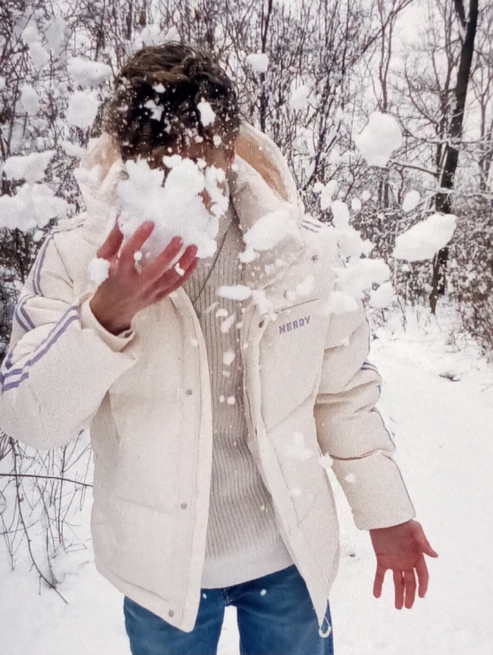 A mid-shot photograph depicts a single individual in a snow-covered forested area, identified as Mežaparks, Riga, Latvia. The subject has light brown, curly hair and is wearing a cream-colored puffer jacket with three parallel light purple stripes on the upper left arm and the blue text "NERDY" on the left chest. A cream ribbed knit sweater is visible underneath the jacket, and the subject wears blue jeans. A significant amount of snow is actively impacting or being held against the subject's face, resulting in numerous smaller snow particles dispersing upwards and outwards around their head and shoulders. The subject's left hand is raised, partially obscuring the lower face, while the right arm hangs slightly extended at their side. The ground is uniformly covered in white snow. The background consists of a dense arrangement of bare, dark-branched trees, characteristic of a deciduous forest in winter.
