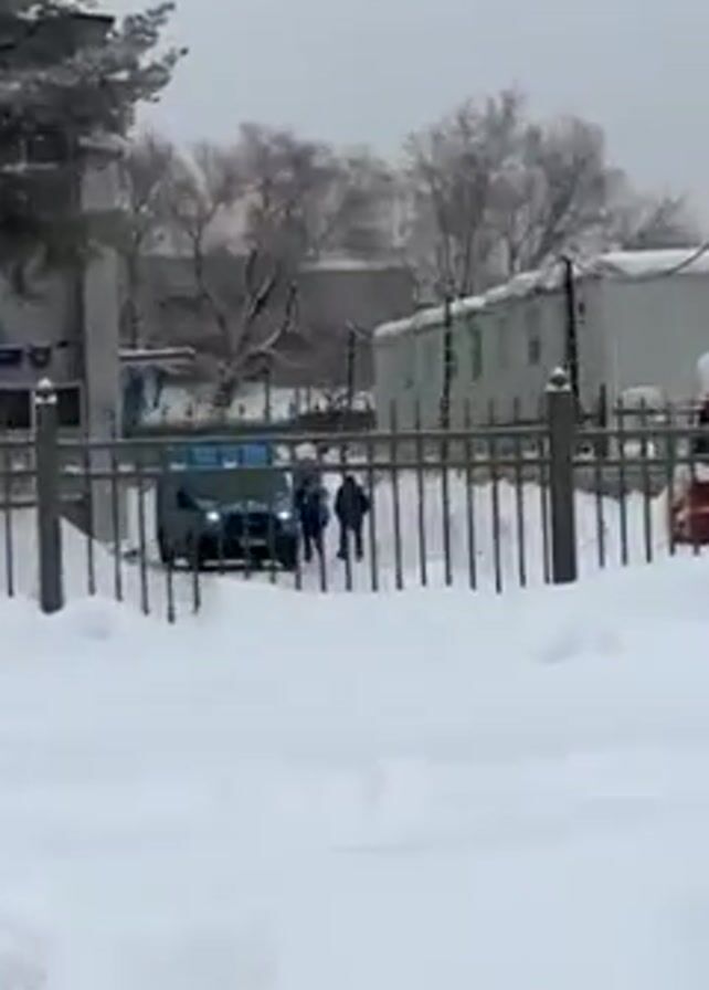 The video depicts a snowy scene. Thick snow covers the ground. The sky is overcast. A metal fence runs across the middle ground of the shot. Behind the fence is a building, some bare trees, and several vehicles. A light blue van is parked near the fence. Two people wearing dark blue winter coats are walking away from the van and behind the fence. A yellow school bus is parked further back behind the fence.