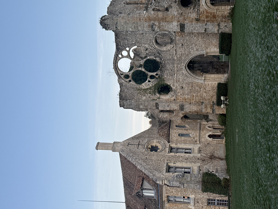A partially ruined stone building stands adjacent to a building with a gabled, tiled roof and a prominent chimney. The ruined structure features large, circular openings and an arched entrance. Both buildings exhibit intricate stonework. Greenery is present in the form of a lawn and hedges near the buildings. The sky is visible in the upper left corner.