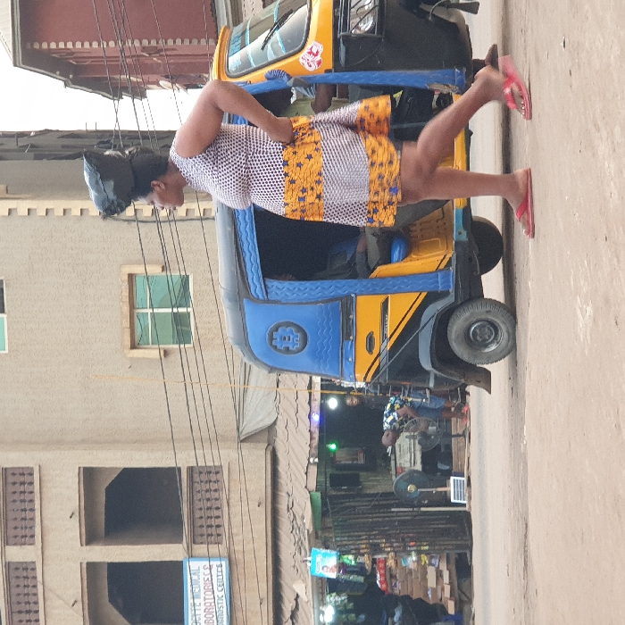 A woman wearing a patterned dress, a black object on her head, and red sandals is stepping into a blue and yellow auto rickshaw